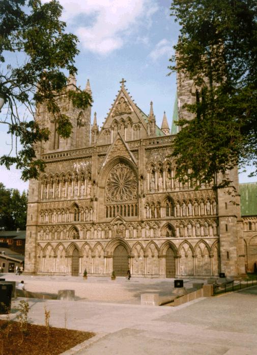 zurück - vorDer Nigardsdom zu Trondheim. An der Frontfassade sind eine ganze Menge Menschen, die in der Stadtgeschichte von Trondheim (997 - 1997 = 1000 Jahre) eine Rolle gespielt haben in lebensgrösse dargestellt ...