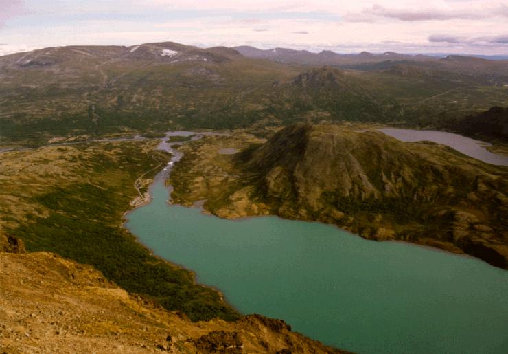 zurück - vorJotunheimen - das Hochgebirge Norwegens. Unten der See ist der Hochgebirgssee 'Gjende' auf 997m
